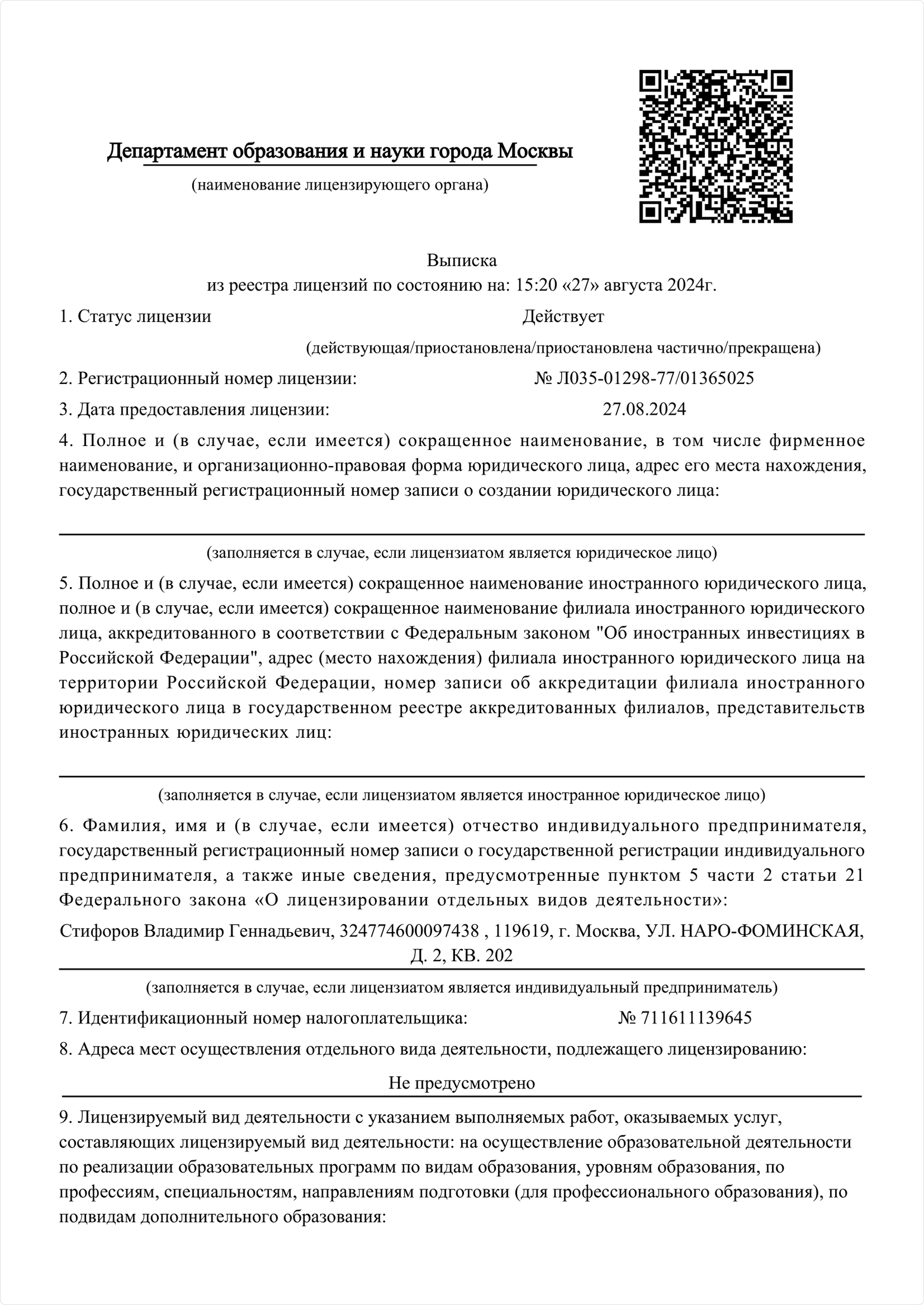 Наша школа дает всю необходимую информацию по актуальным требованиям СанПин, программа обучения утверждена департаментом образования города Москвы.
